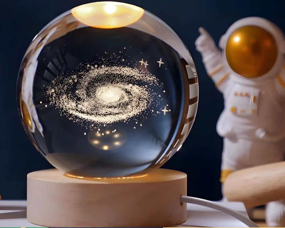Luminária Cristal LED Planeta Terra, Lua, Galáxia e Sistema Solar com Base de Madeira | Elizium Store